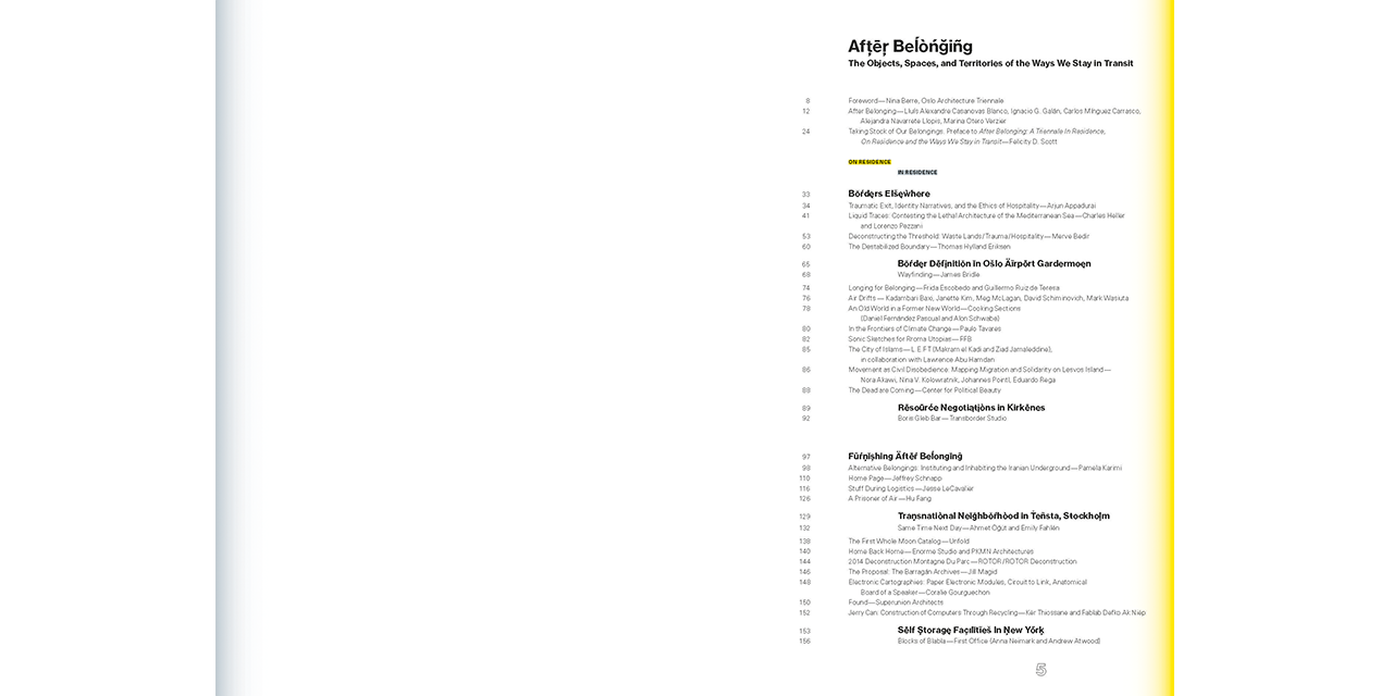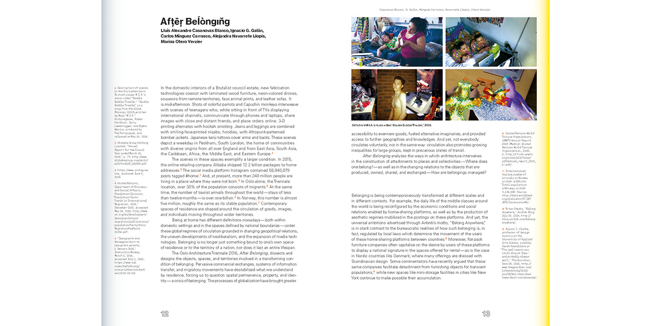 After Belonging examines the objects, spaces and territories of our transforming condition of belonging. The global circulation of people, information and goods has destabilized what we understand by residence, questioning spatial permanence, property and identity—a crisis of belonging.