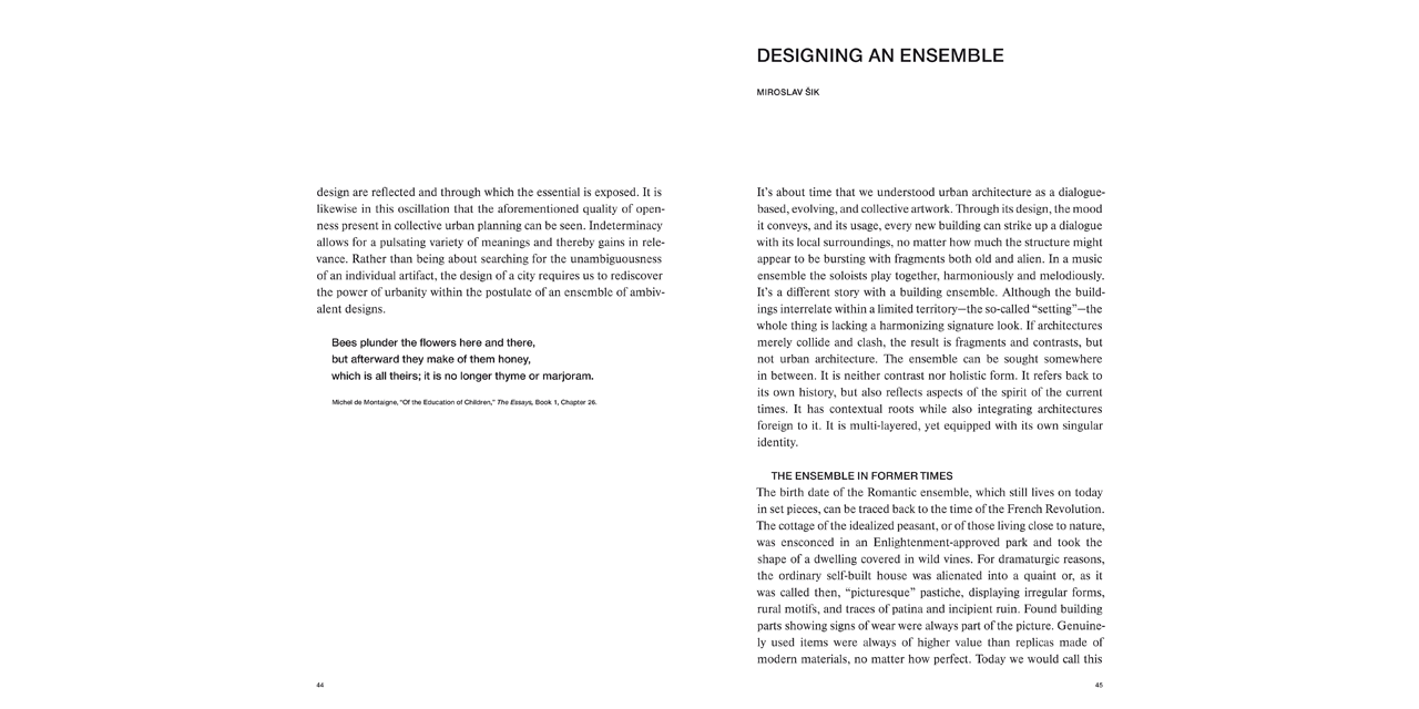 And Now the Ensemble!!! is intended as a challenge to architects, their clients, and commissioning authorities to understand and create urban development as a dynamic and collective work of art and to make dialogue central to design. Design, atmosphere, and usage can make every new building relate to its local surroundings. As a design process, this contextual expansion does not simply imitate the urban pattern, but also interprets what is already there, to some extent modernizes it, makes the familiar alien by employing unusual atmospheric imagery, and ultimately transforms the accumulated chaos of soloists into an orchestrated whole.
