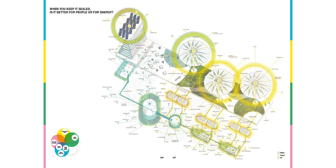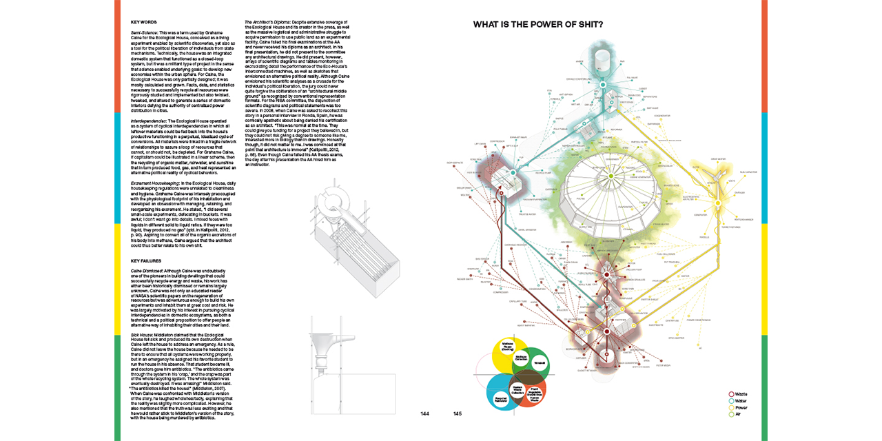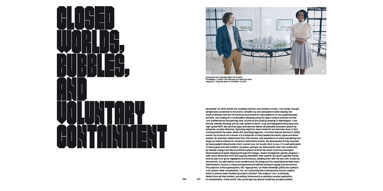 In The Architecture of Closed Worlds prototypes are presented through unique discursive narratives with historical images. Each includes new analysis in the form of a feedback drawing that problematizes the language of environmental representation by illustrating loss, derailment, and the production of new substances and atmospheres.