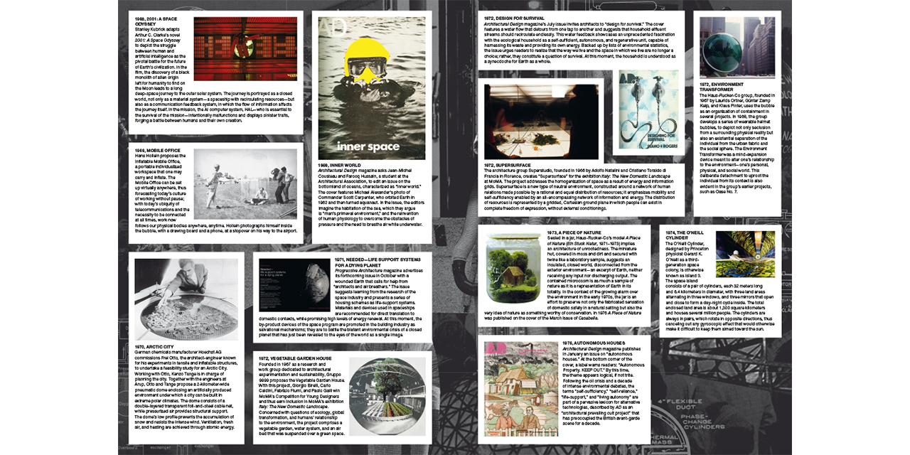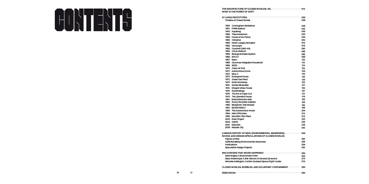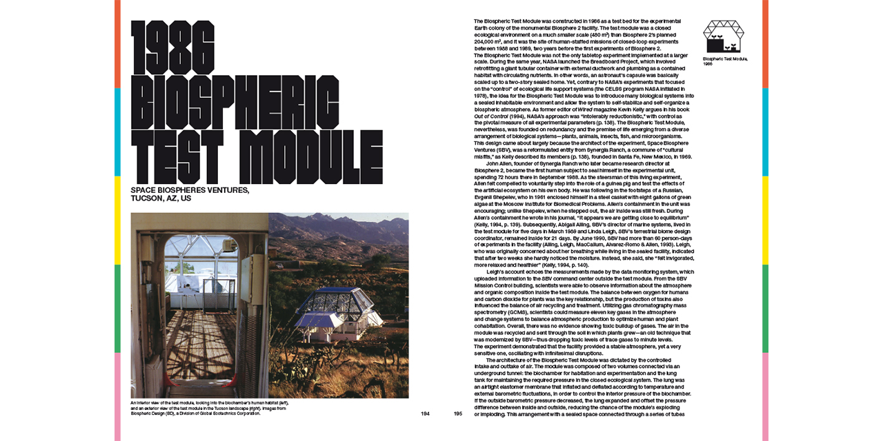 From the space program to countercultural architectural groups experimenting with autonomous living, this publication documents a disciplinary transformation and the rise of a new environmental consensus in the form of a synthetic naturalism. It presents an archive of 37 historical living prototypes from 1928 to the present that put forth an unexplored genealogy of closed resource regeneration systems.