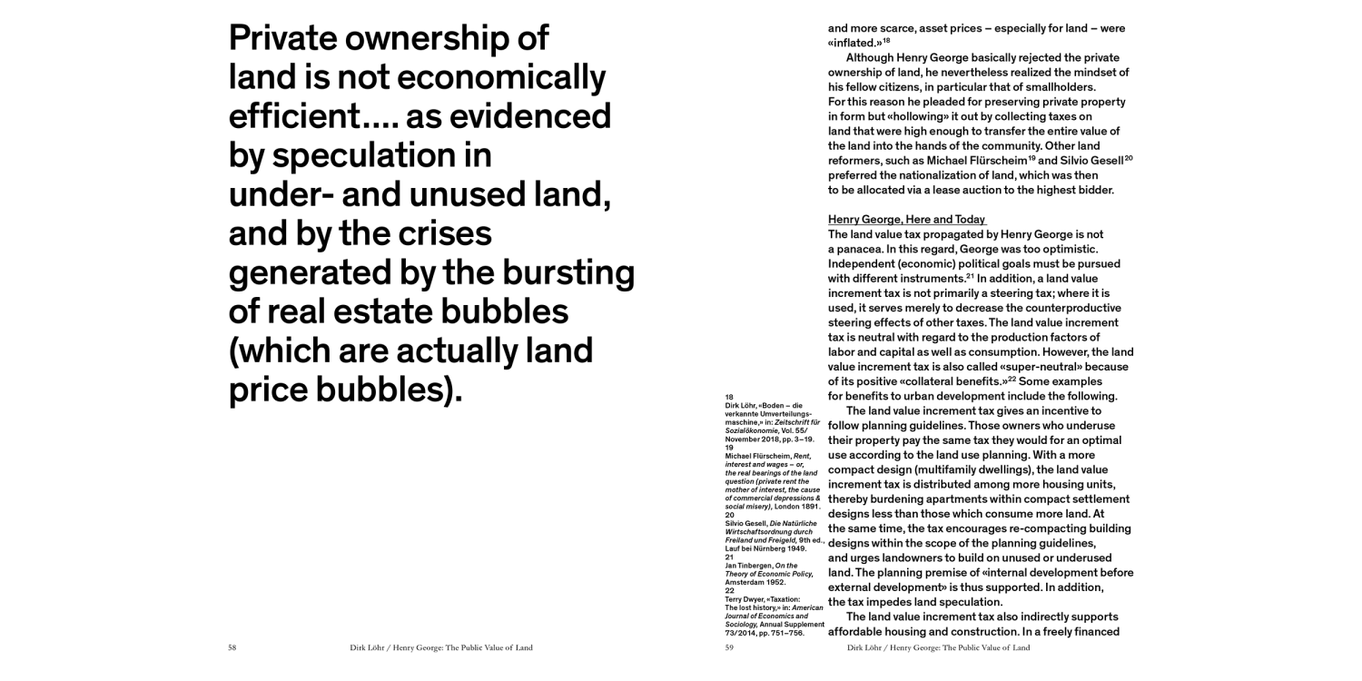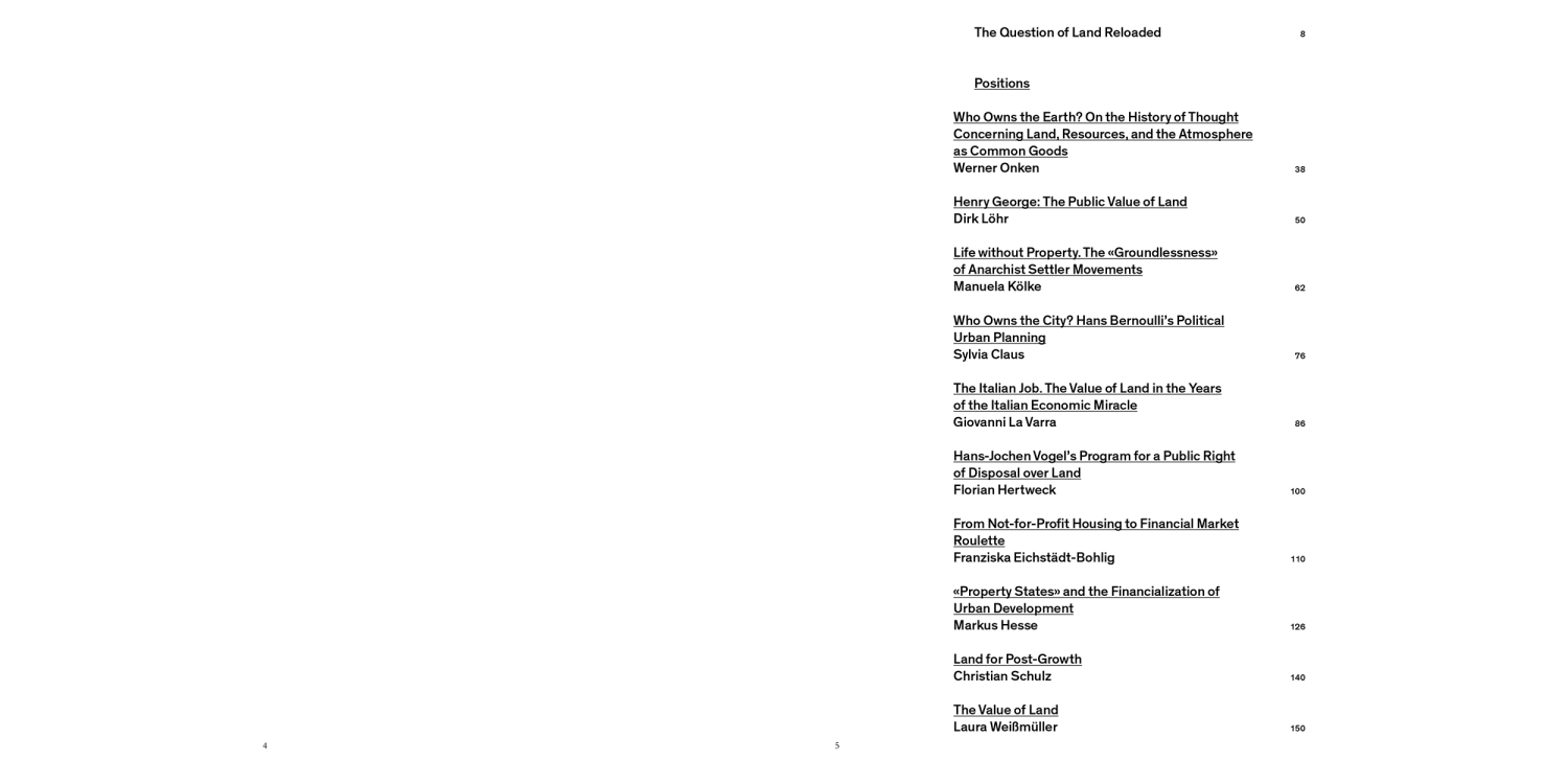 How we deal with land has far-reaching implications for architecture and urban development. The last decade has seen a dramatic rise in the privatization of urban land and in speculation. Many European cities that today find themselves under extreme development pressure have virtually no land left to build on. In view of the acute housing shortage, the issue of who owns the land is therefore more relevant than ever: To what extent are we able to treat the land as a common good and guard it from the excesses of capitalism?