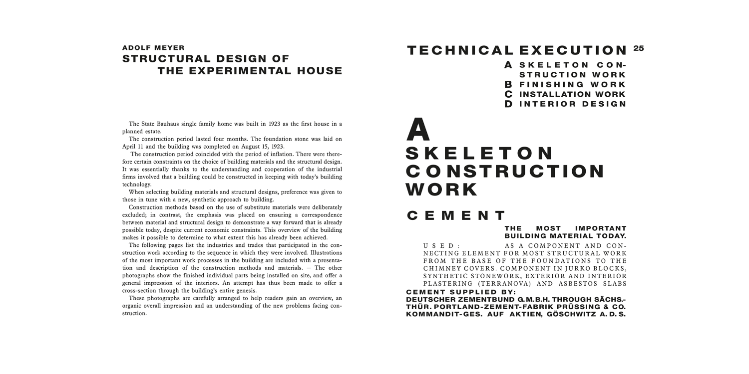 The book about the project was compiled in the summer of 1924 and became the third volume of the Bauhausbücher. Following an essay by Walter Gropius that supplies information on the “Housing Industry,” Georg Muche presents the design of the model building. Adolf Meyer then describes its technical execution, giving details on the companies involved.