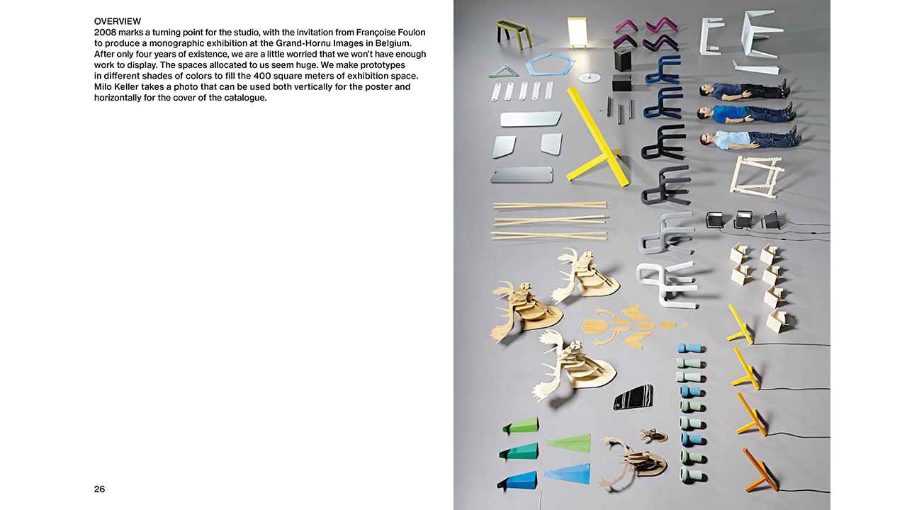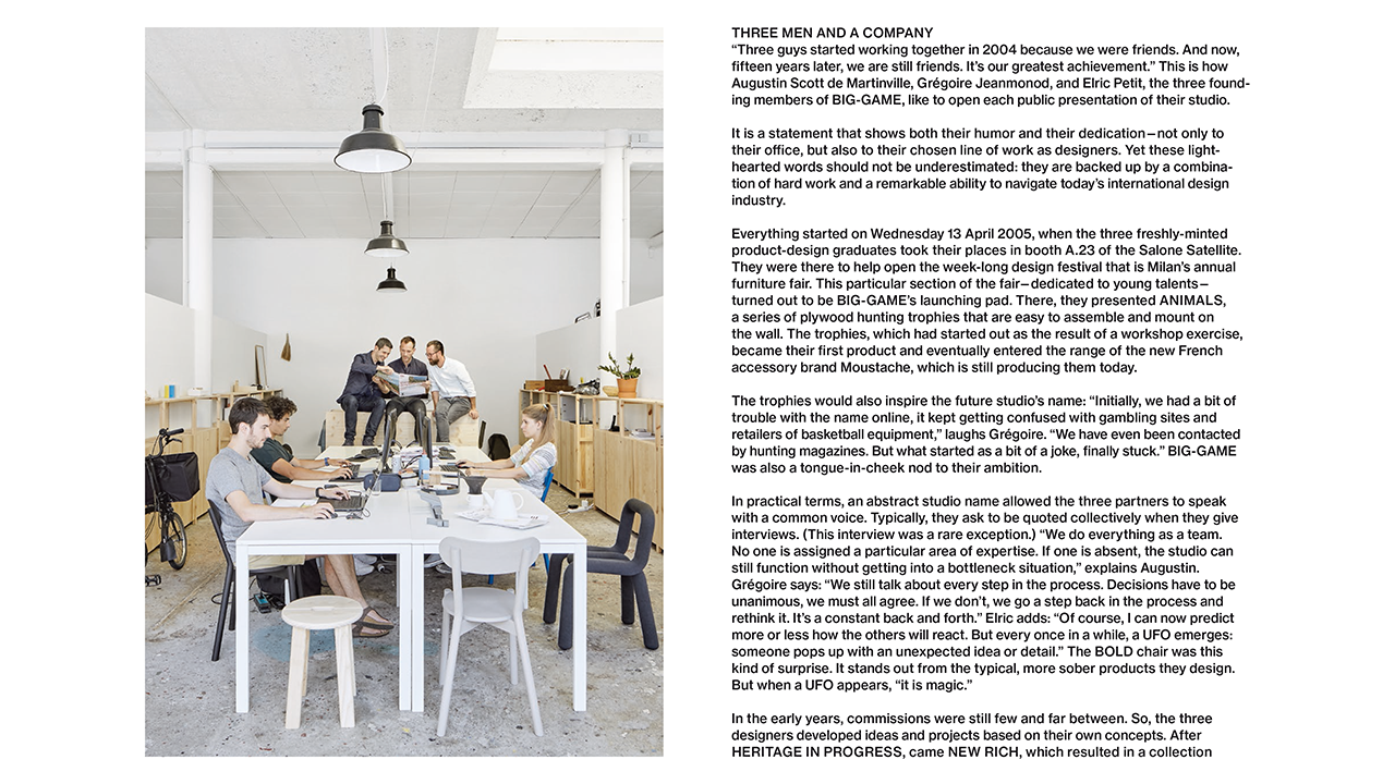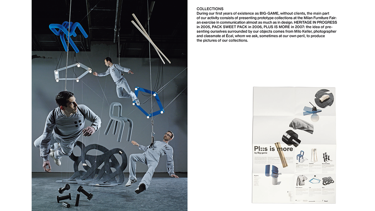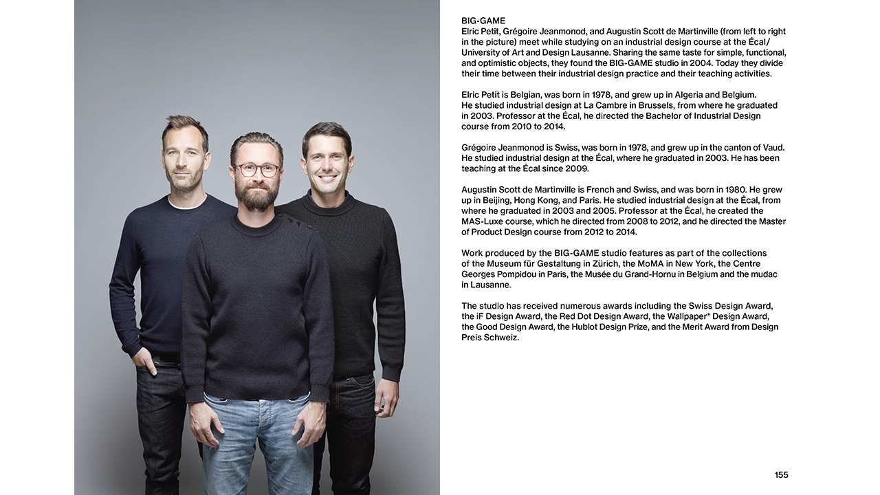 Based on a series of informal interviews, the main text by famous design critic Anniina Koivu explains the design process within this modern-day design collective. The epilog by curator of mudac, Susanne Hilpert Stuber, casts a light on the relationship between BIG-GAME and today’s Swiss design industry, and puts it in an international context.