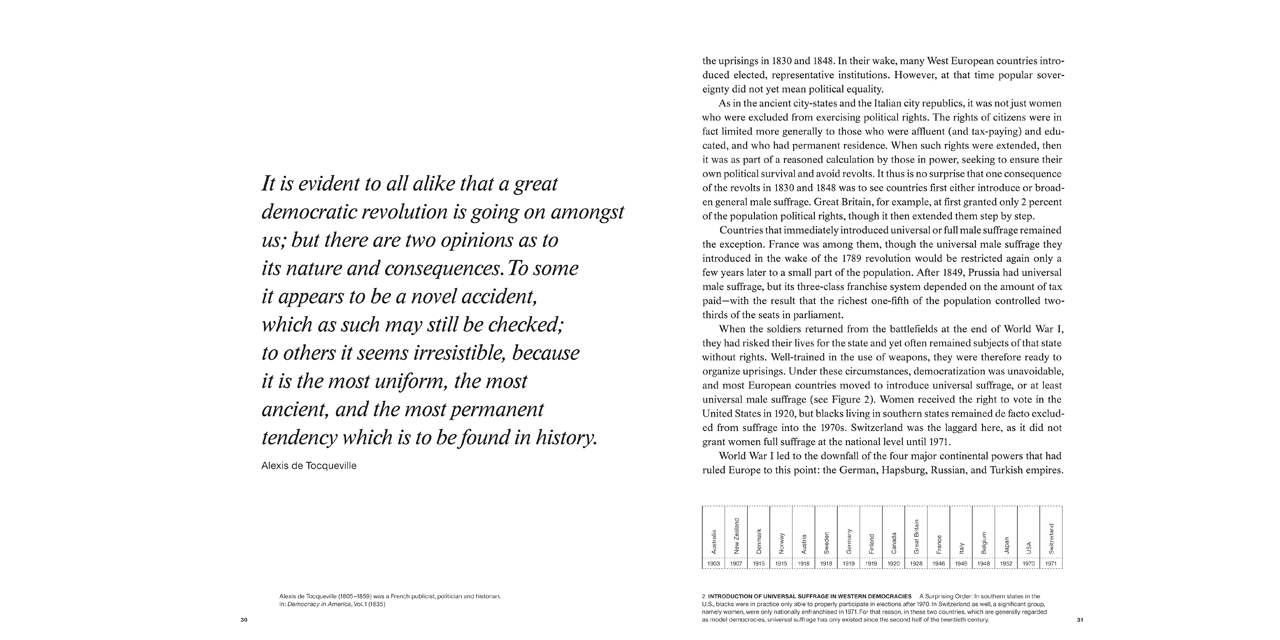 Democratically-ruled nations try to strike a difficult balance between equality and liberty, as well as between majority and minorities. They try to maintain order in society while allowing for the greatest possible expressions of opinion. Democracy demands and democracy challenges—and as a system of government, democracy is itself challenged today by globalization and the development of digital media. Against this background, and in light of political and economic events in Asia or in the Arab world, there is another incessant question: is democracy still up-to-date? But of course! Democracies perform generally better and ensure peace more successfully than other forms of government.