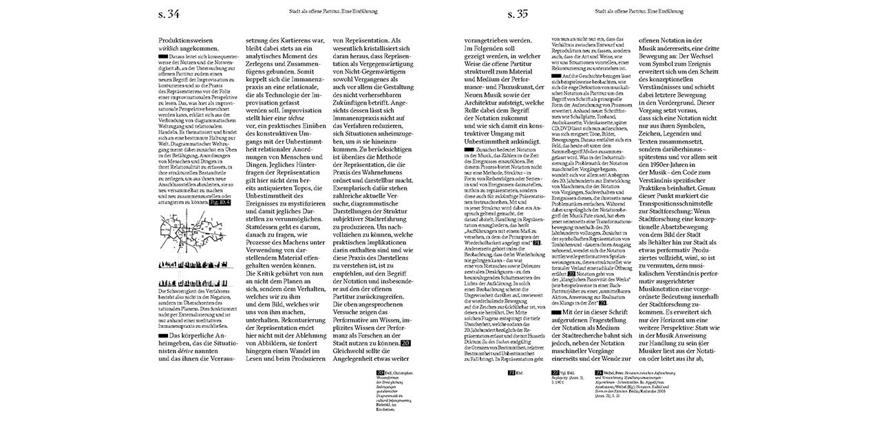 In seiner jüngsten Publikation skizziert Christopher Dell eine «offene Stadt-Partitur». Der Begriff bezieht sich weder auf die Darstellung einer urbanen Klangtextur, noch wird die Stadt in einem ästhetischen Sinn oder im Sinn von Musikprogrammierung interpretiert. Stattdessen werden städtische Prozesse in neuer Form sichtbar gemacht, indem eine musikalische Art der Konzeption von Raum als Filter und Perspektive eingesetzt wird; denn Zeitlichkeit und die Dimension des aktiven Tuns sind bei der Enthüllung von visuellen Strukturen praktischer, städtebaulicher Phänomenen wichtige Komponenten.
