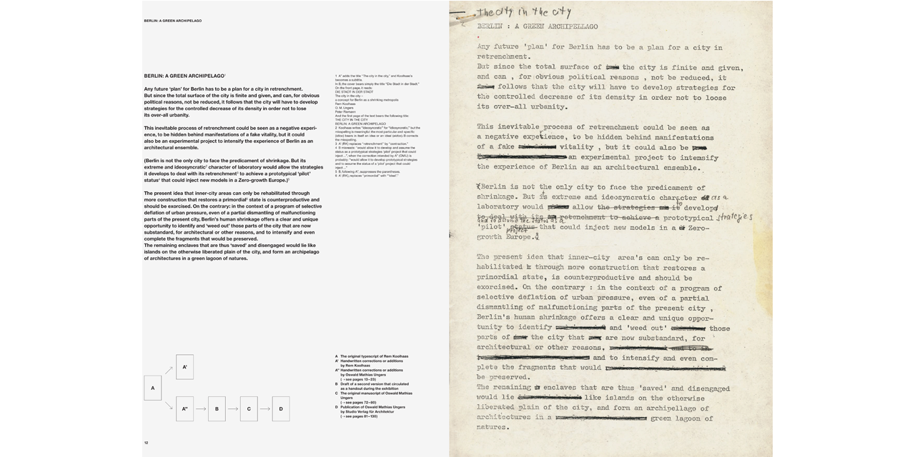 Diese kritische Ausgabe enthält eine Reproduktion des Ungers-Manifests und eine bislang unveröffentlichte, von Rem Koolhaas verfasste Version sowie Interviews mit den (Co-)Autoren Rem Koolhaas, Peter Riemann, Hans Kollhoff und Arthur Ovaska. Einleitungstexte erläutern die Entstehung des Manifests zwischen Cornell und Berlin, verorten das Werk in der Planungsgeschichte Berlins und stellen dessen Einfluss auf aktuelle Ansätze heraus.