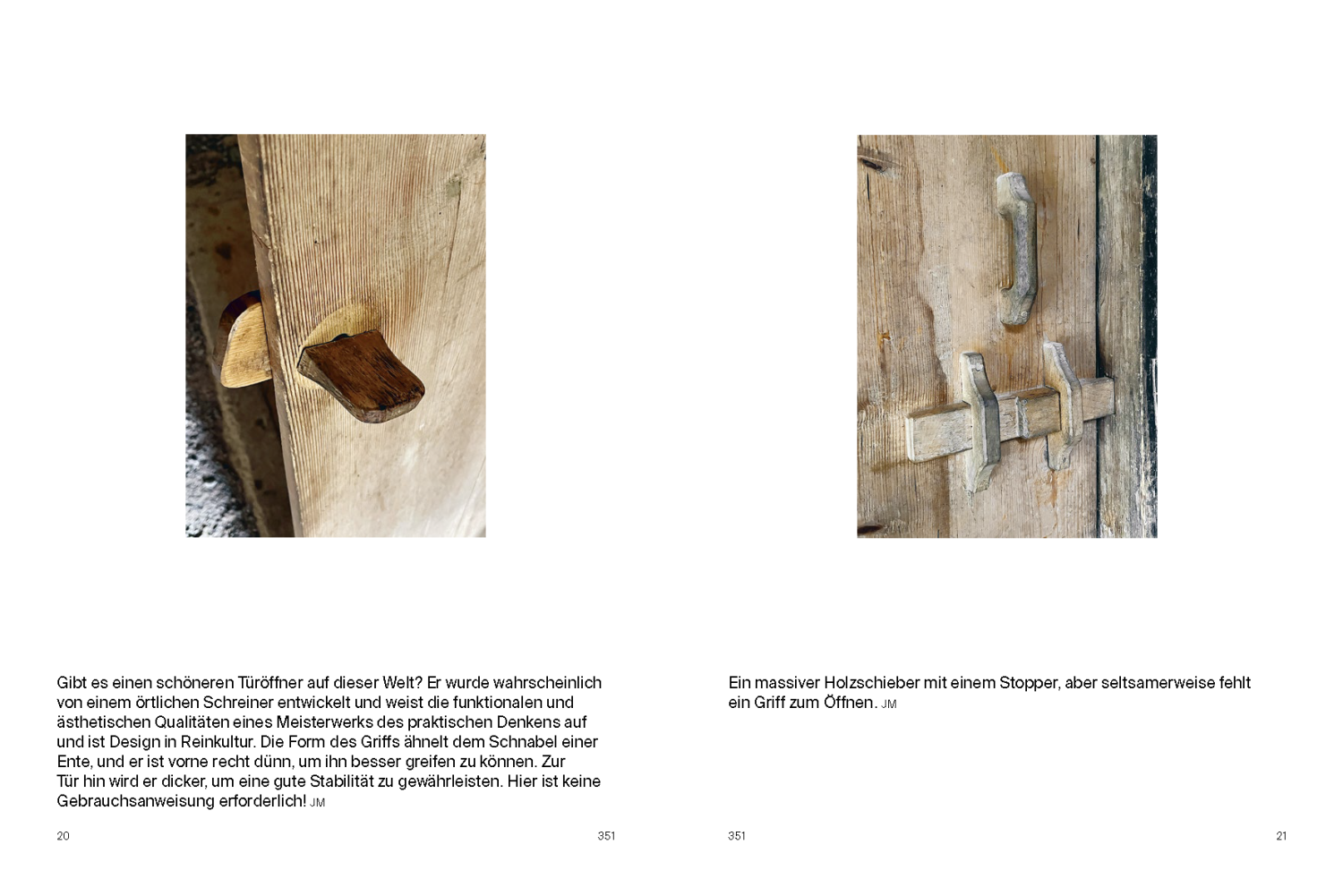 «Wenn designaffine Menschen das Freilichtmuseum Ballenberg in Hofstetten bei Brienz BE entdecken, kann daraus ein erstaunliches Buch entstehen. (...) Es ist ein sehr ästhetisches Buch, das mit ruhig anmutenden Fotografien Details von Bauten aus früheren Zeiten ins Zentrum rückt oder die Betrachterinnen einlädt, bei einem Haus zu verweilen und es in seiner Stattlichkeit zu erfassen.»