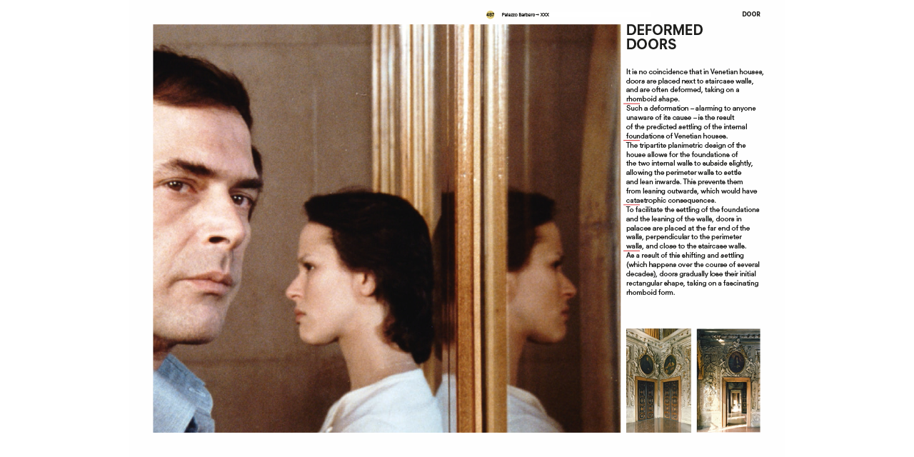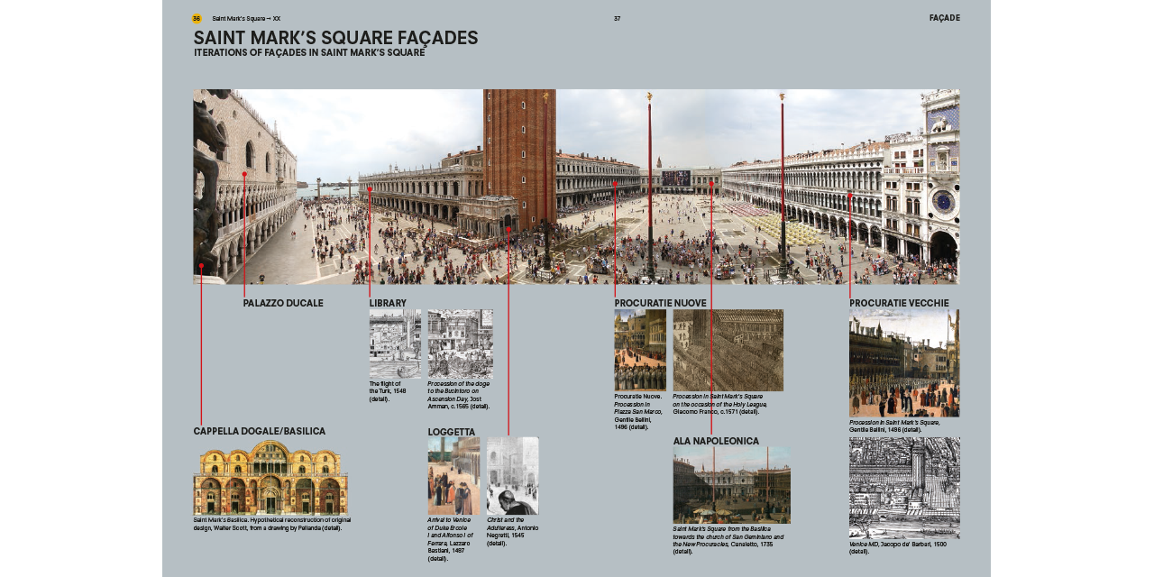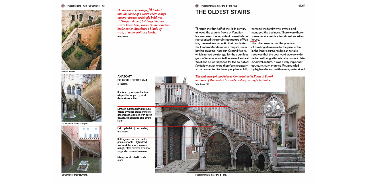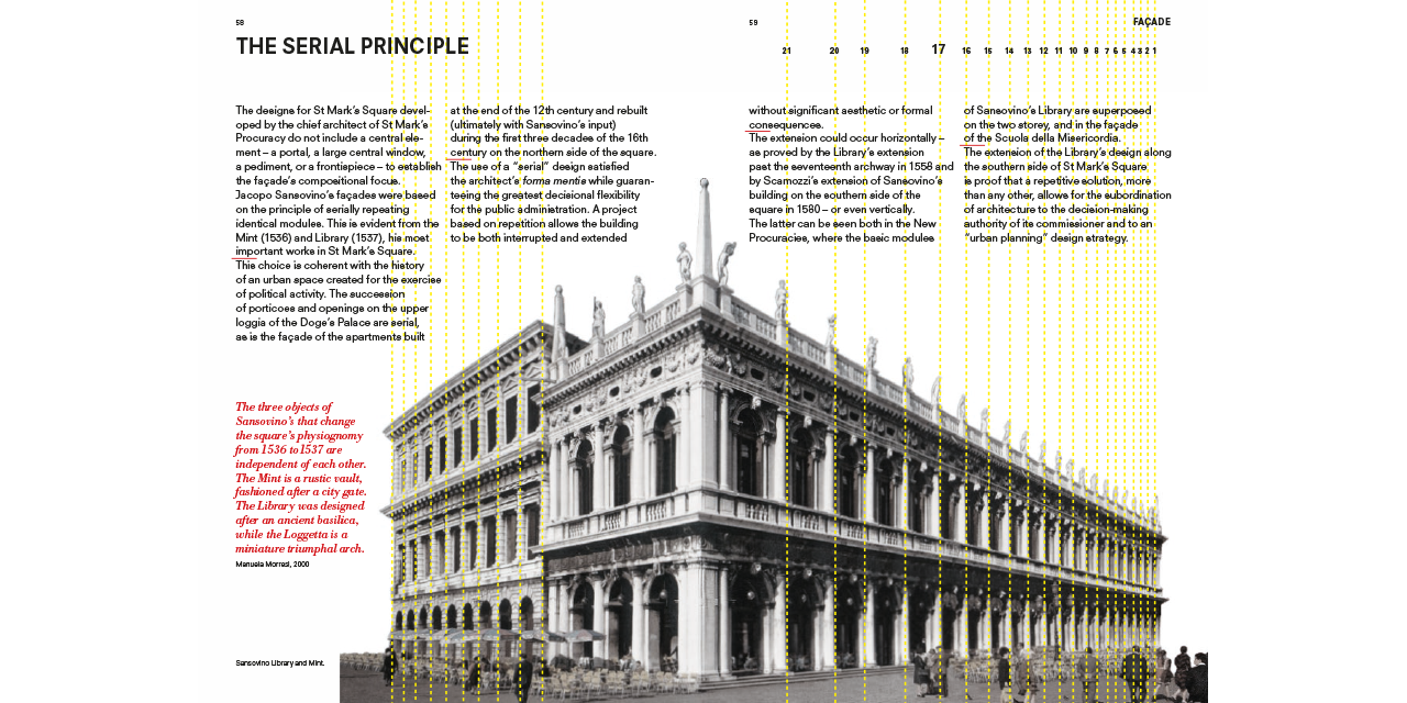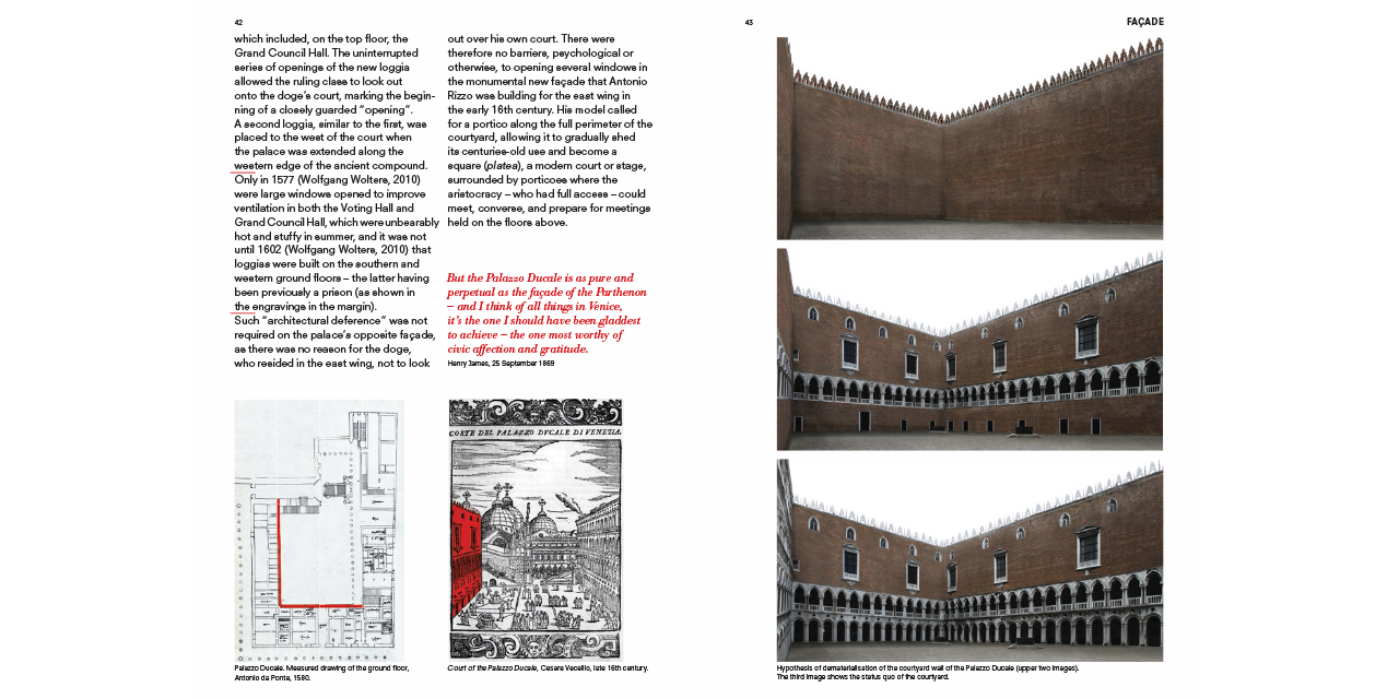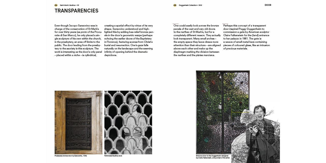 Developed as a parallel research project of Fundamentals—the exhibition at the 14th Venice Architecture Biennale curated by Rem Koolhaas—the book offers insights on Venetian façades, stairs, corridors, floors, ramps, ceilings, doors, hearths, windows, balconies and walls. “Product not [only] of the mind but of societal organization” the elements are isolated from their picture-perfect context and from the postcard view of Venice that is impressed in our retinas, introducing the reader—through a combination of collages, drawings, photographs, paintings, film stills and quotes—to a radically new way of seeing Venice. Like a camera obscura photograph cuts through the often irrelevant embellishments of architecture to reveal the underlying skeleton of a building (i.e. its elements), this guide will allow the reader to better understand the fundamental transformations that have shaped Venice during the past ten centuries. This city, which for many is—architecturally speaking—permanently frozen in time, has in fact often been at the forefront of challenging the architectural conventions and underwent an unprecedented urban transformation.