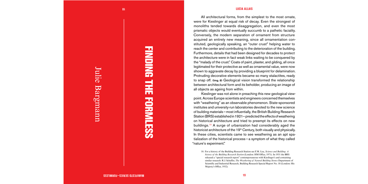 Struggles to escape form as a manifestation of various norms and constraints are as old as architecture itself. But the formless is also increasingly in the air today, explicitly as in discussions of the “formless” quality of the city, and implicitly in talk of atmospheric buildings, randomized structures, and the dematerialization (or increased mediation) of architecture. No doubt part of its appeal lies in the fact that the formless is frequently found at the intersections between architecture and other fields, from art to ecology or engineering. Nevertheless, the formless has not yet been theorized rigorously in architecture. It seems to underpin a wide range of ten- dencies that have not yet been connected, or even explicitly acknowledged or identified. This book represents a first step toward this articulation.