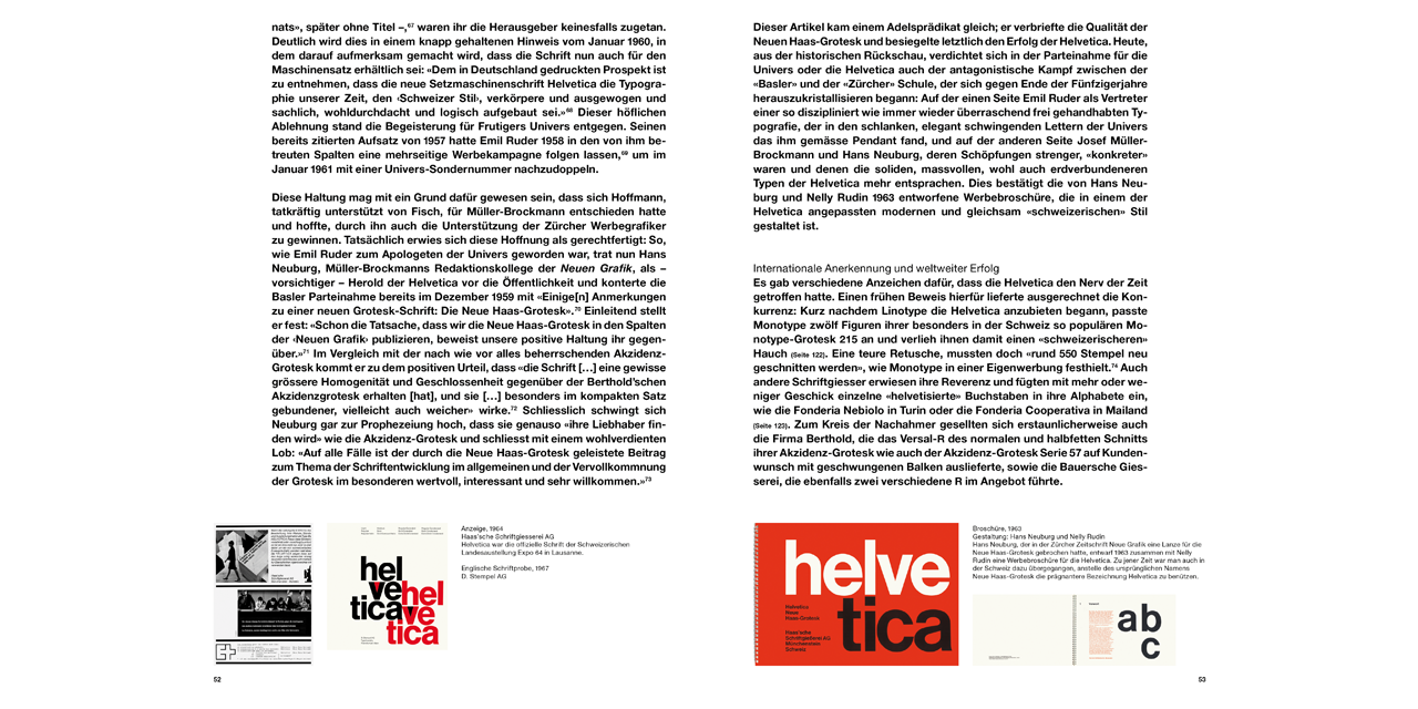 Die Publikation zeichnet die fünfzigjährige Geschichte der Helvetica nach, vergleicht sie mit den bekannten Groteskschriften des 20. Jahrhunderts und untersucht das Phänomen ihrer beispiellosen Verbreitung. Zahlreiche Abbildungen präsentieren eine Vielzahl von Anwendungen der Schrift über fünf Jahrzehnte und aus verschiedenen Anwendungsgebieten – von der Signaletik bis zum Partyflyer.
