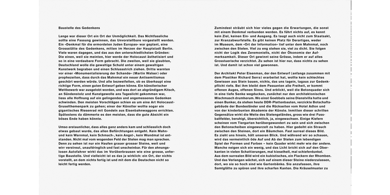 Die Idee, der Holocaust-Opfer mit einem Mahnmal zu gedenken, entstand 1989. Dann wurde geplant, entworfen, gebaut und kontrovers diskutiert. Im Mai 2005 wurde das Denkmal der Öffentlichkeit übergeben. 2700 Betonblöcke fliessen seither unaufdringlich über das riesige Feld und laden ein, darin zu versinken. Das Mahnmal entzieht sich einer klaren Deutung, es taugt nicht zum Staatsakt, folgt nicht den Regeln des Zeremoniells und ist gerade deshalb so spektakulär.