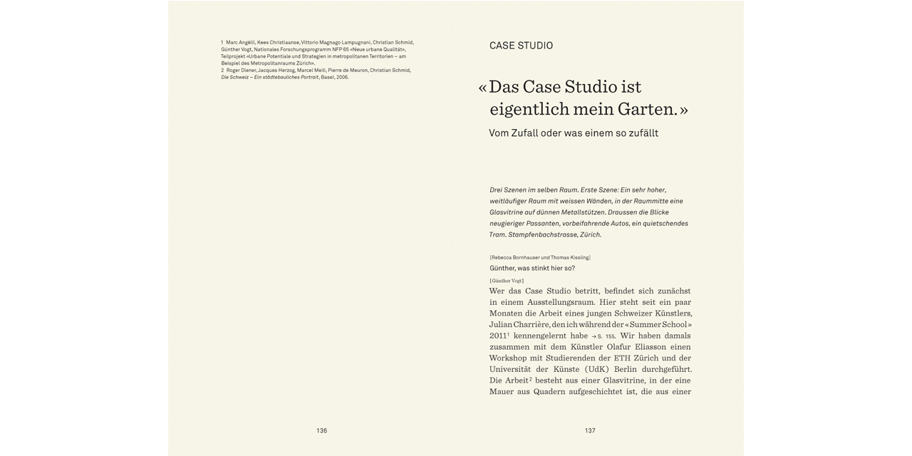 An fünf Schauplätzen spricht Günther Vogt über aktuelle Themen der Landschaftsarchitektur, ihr Verhältnis zur Architektur und zur Stadt, über seine Lehre an der ETH Zürich und die Arbeit von Vogt Landschaftsarchitekten. Das vorliegende Buch kann also gleichsam selbst als Wunderkammer gelesen werden, indem es Einblick in den vielfältigen Kosmos von Günther Vogts Denken und Arbeiten gewährt und letztlich nach einer Haltung fragt.