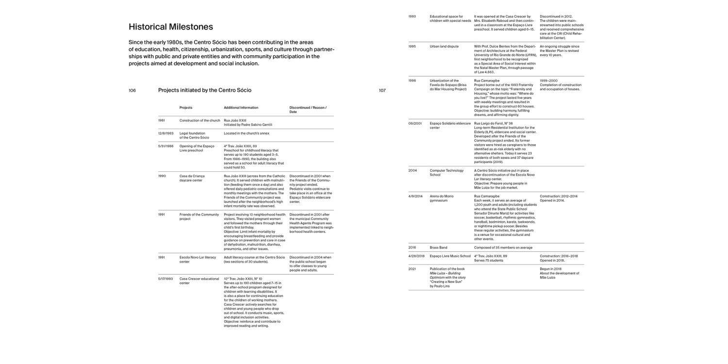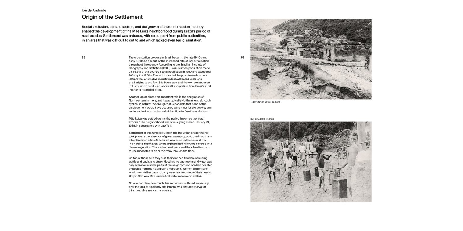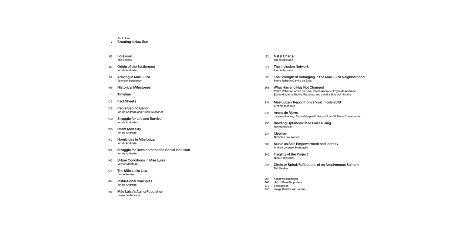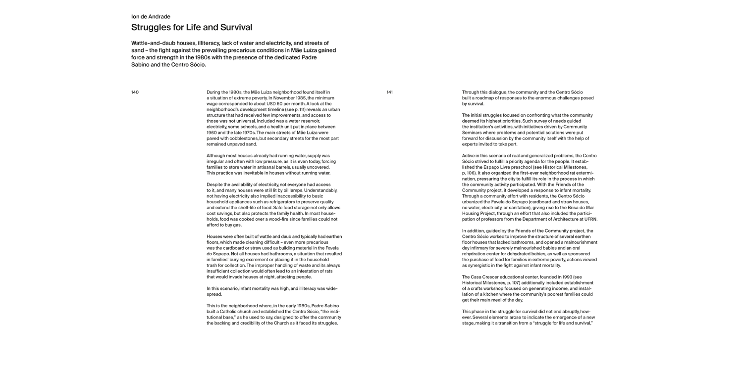 Over the past 30 years, the district of Mãe Luíza in Brazil's northeastern city of Natal developed from a desolate favela into a functioning community. From the first humanitarian aid to construction of a gymnasium, this persistent process is outlined in short articles and essays in the second part of this richly illustrated volume. The documentation impressively demonstrates how transformation was achieved step by step with the help of many, laying the groundwork for ongoing progress. Less crime, better education, and a fairer society – much has been accomplished and even more is possible for the future.