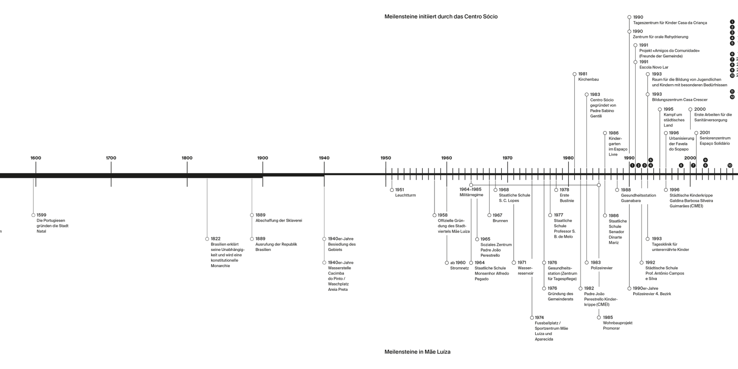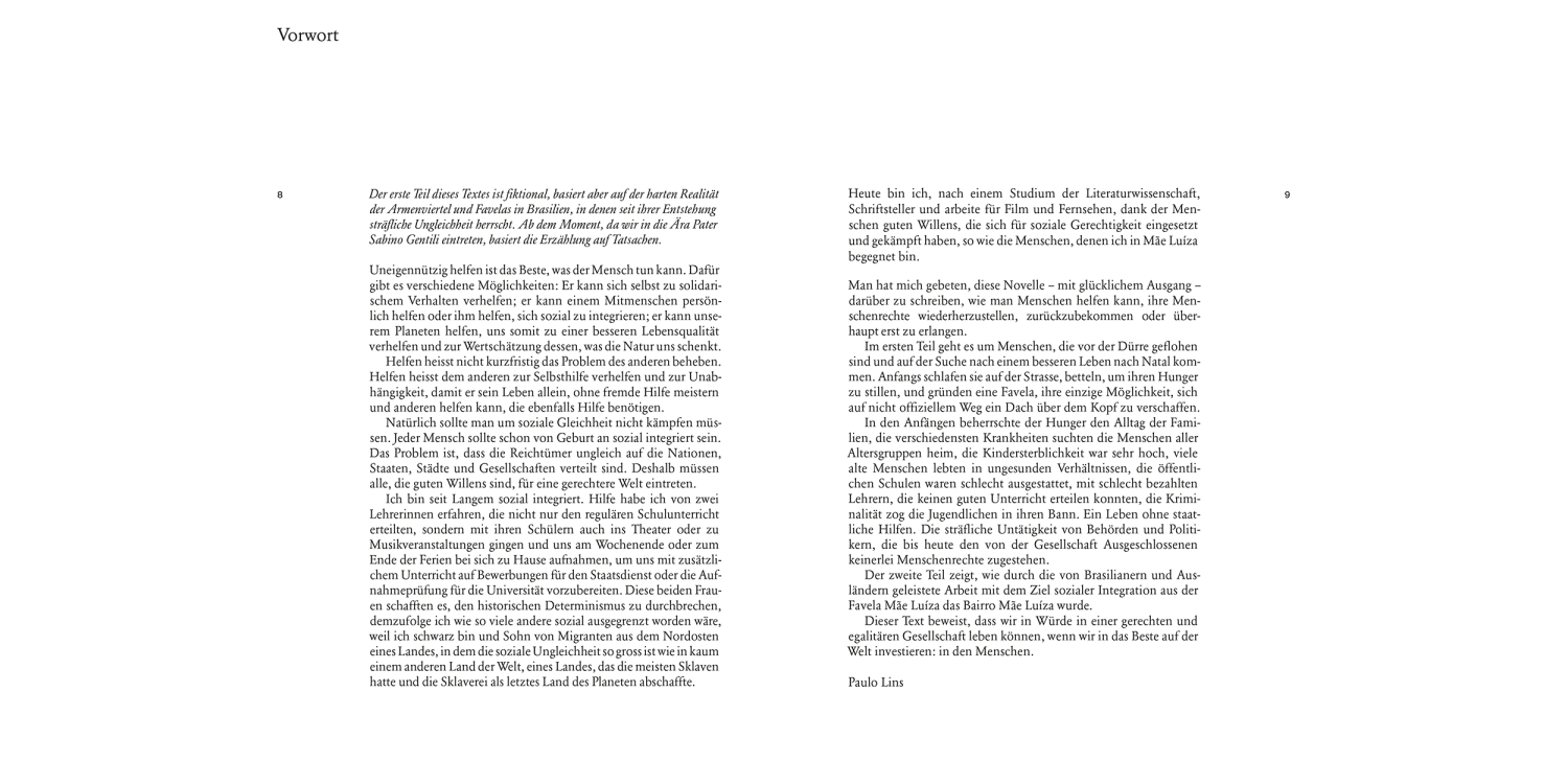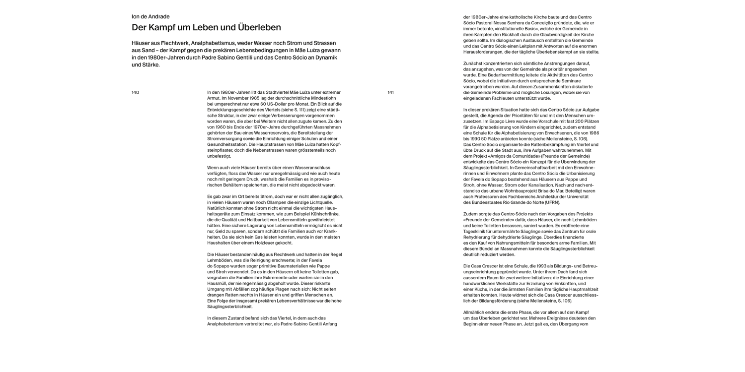 Der Stadtteil Mãe Luíza in Natal im Nordosten Brasiliens entwickelte sich in den vergangenen dreissig Jahren von einer trostlosen Favela zu einer funktionstüchtigen Gemeinde. Von der ersten humanitären Nothilfe bis zur Errichtung eines Sport- und Begegnungszentrums wird dieser beharrliche Prozess im reich bebilderten Band in kurzen Artikeln und Essays nachgezeichnet. Die Dokumentation belegt eindrücklich, wie die Transformation in kleinen Schritten und mit der Hilfe Vieler gelingen und die Grundlage für eine dauerhafte Entwicklung geschaffen werden konnte. Weniger Kriminalität, eine bessere Bildung und eine gerechtere Gesellschaft – es ist vieles erreicht und noch mehr möglich.