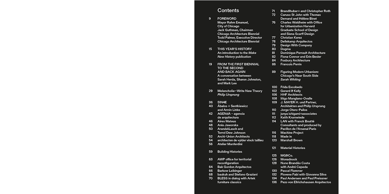The 2017 Chicago Architecture Biennial focuses on the efforts of contemporary architects to align their work with versions of history. The act of looking to the past to inform the present has always been central to architecture. The biennial and hence the book present the chance to consider anew the role history plays in the field today and to try to rethink this collective project of architecture.