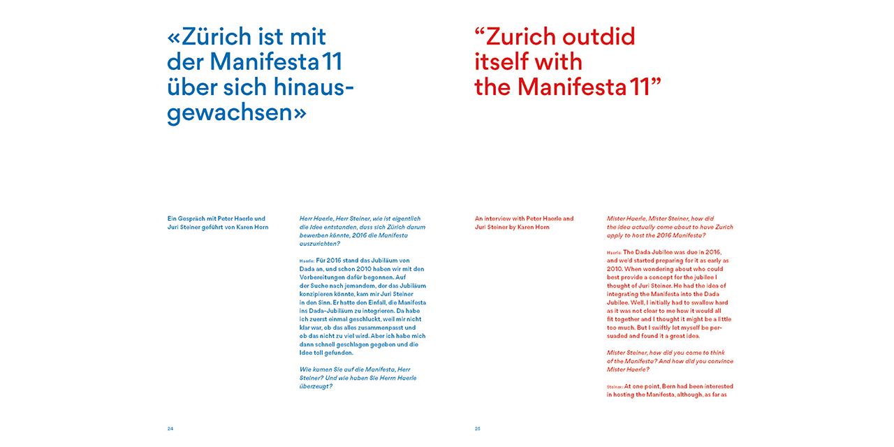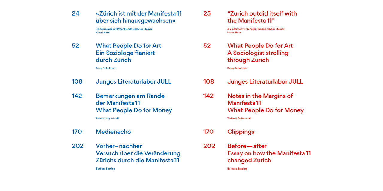The book Manifesta 11 in Zürich documents the collective art experiment Manifesta 11, which took over the city of Zurich in the summer of 2016, and acts as a collection of memories. For the first time the European biennial not only offered a platform to established artists and institutions but served as a melting pot and unconventional meeting point for art professionals and the public alike by enabling inspiring encounters through creating informal venues.