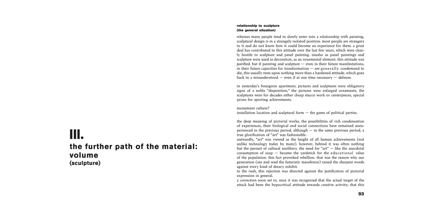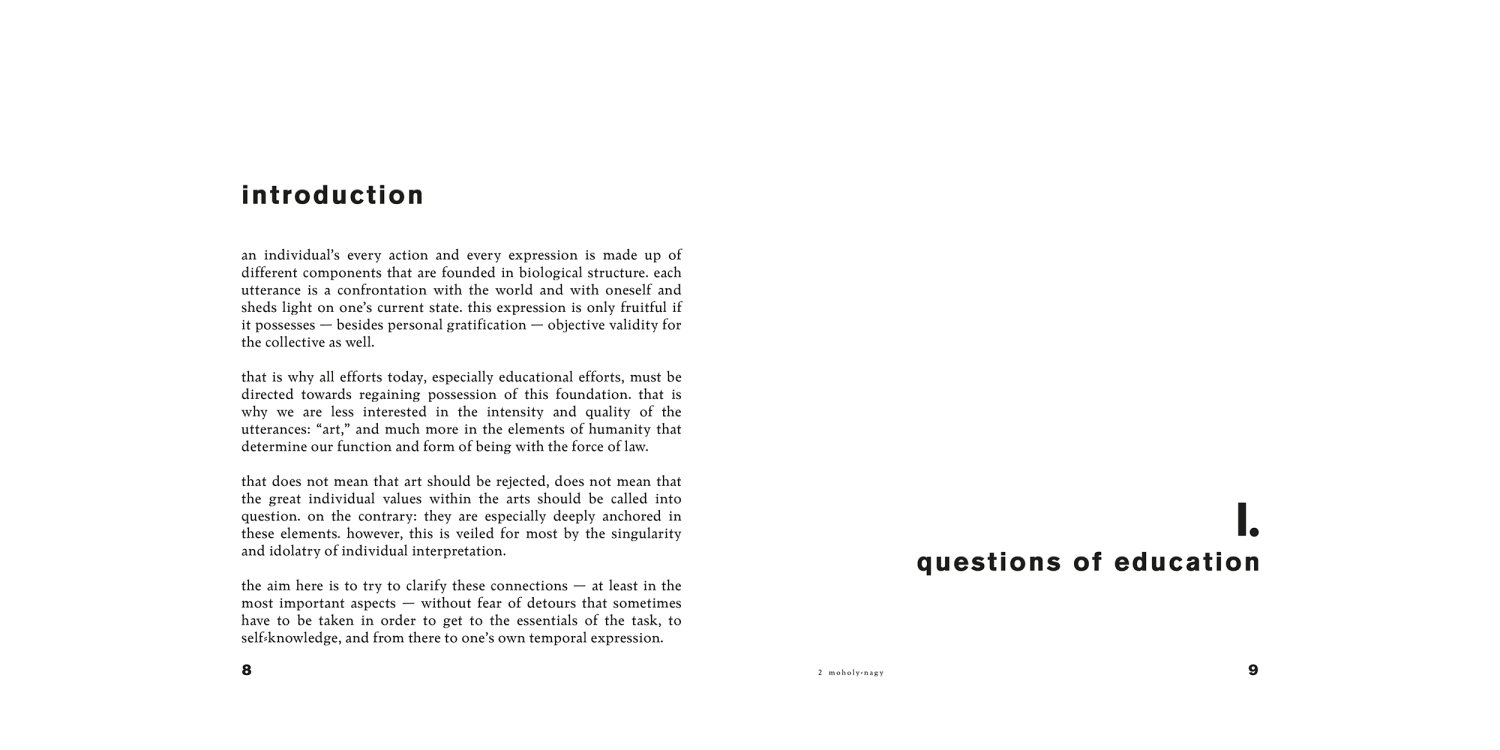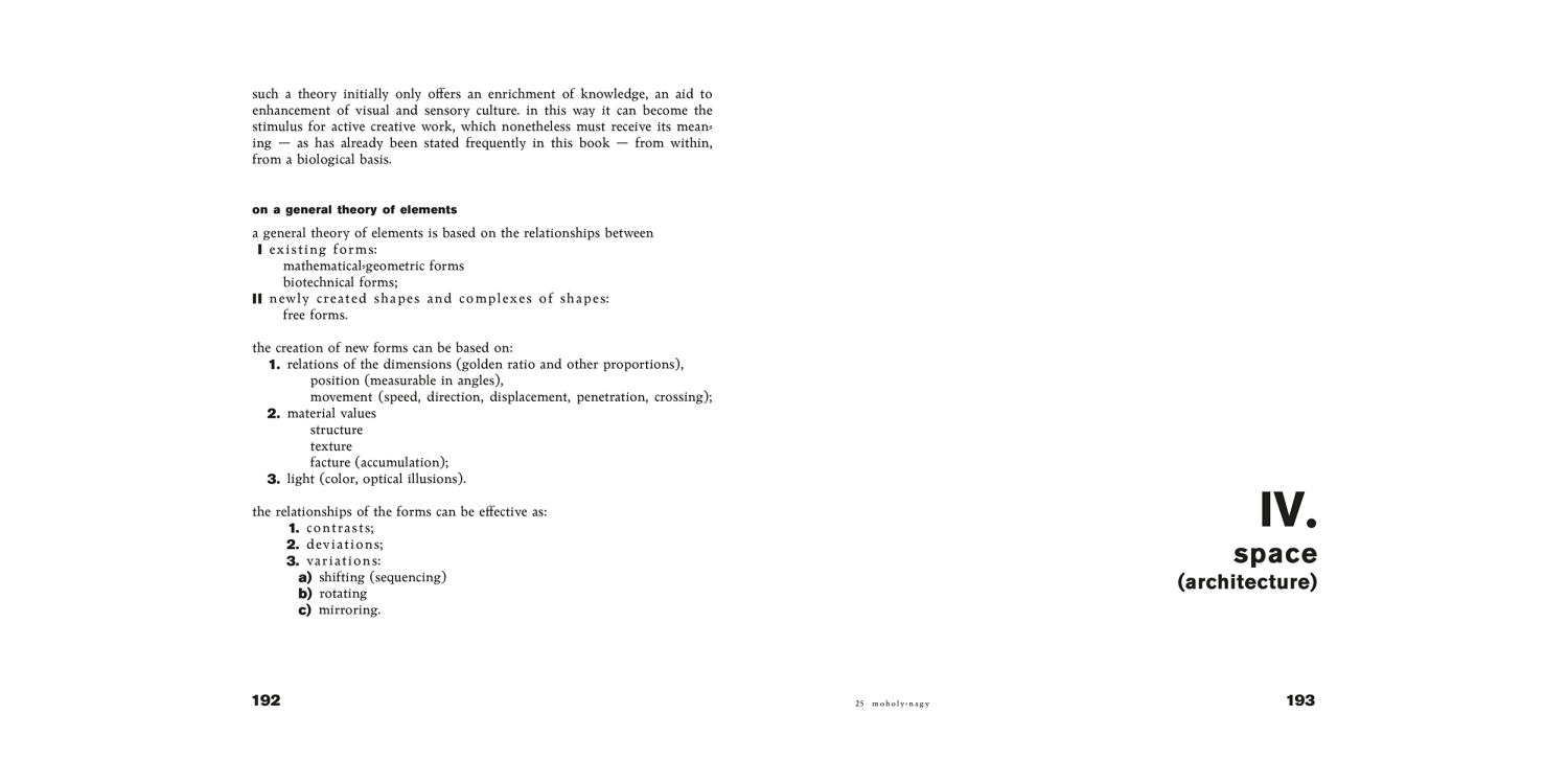 Moholy-Nagy’s second contribution within the series (he also wrote Painting, Photography, Film, volume 8) searches “for the closest connection between art, science and technology by aiming for the training of finer sensory perception.”