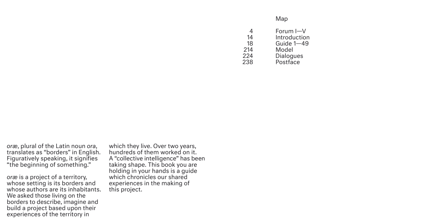 This guide invites readers to an unplanned journey inside oræ. It is a non-hierarchical succession of fragmentary narratives coming from borders and the imaginations of those living in their vicinity.