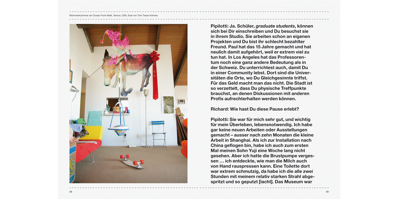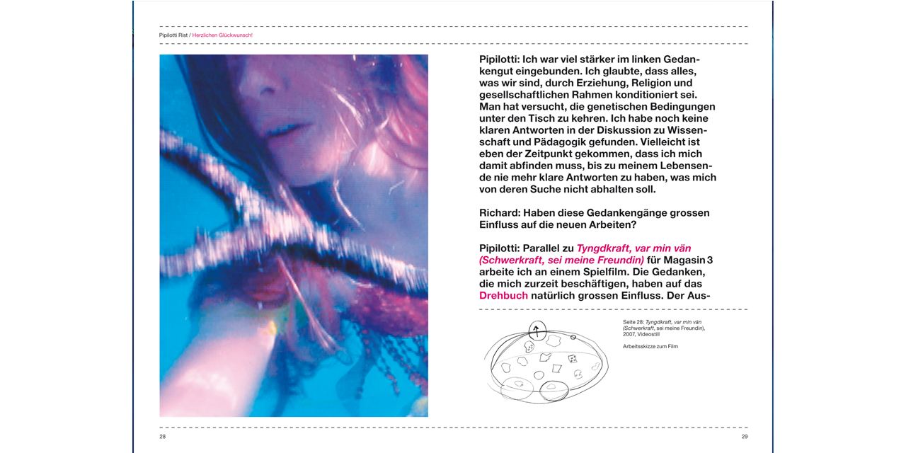 Pipilotti Rist, eine der gefeiertsten Schweizer Künstlerinnen der Gegenwart, und Richard Julin, Chefkurator der Magasin 3 Stockholm Konsthall, haben sich in Zürich einen Tag lang den Vorbereitungen von Rists Einzelausstellung Gravity, Be My Friend in Stockholm gewidmet. Das aus dieser Begegnung resultierende Buch eröffnet neue Dimensionen von Pipilotti Rists Welt und fördert Anekdoten aus dem kreativen Prozess zu Tage. Das reich illustrierte Buch zeigt u. a. Bilder des Werks Tyngdkraft, var min vän sowie von Arbeiten wie Homo sapiens sapiens, 2005, A Liberty Statue For Löndön, 2006.