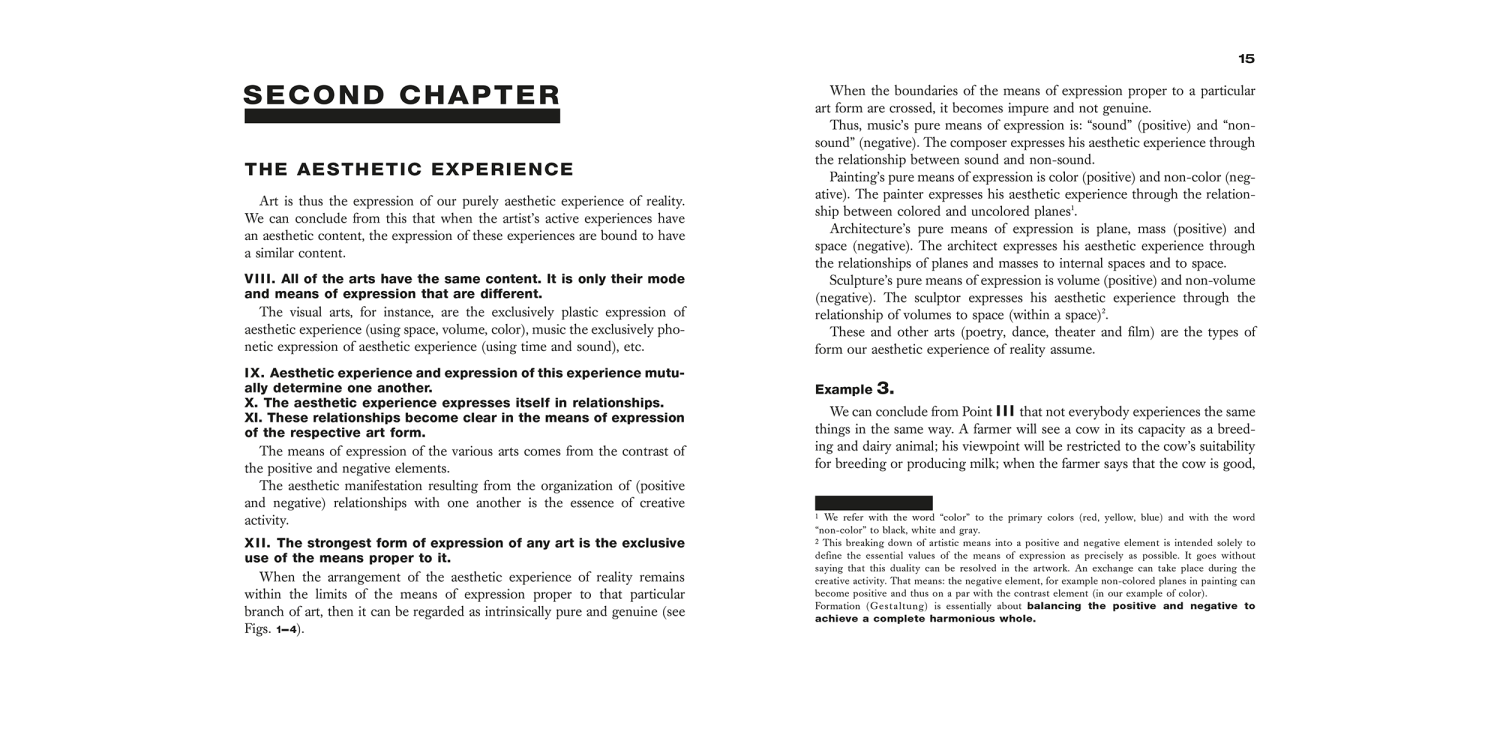 Theo van Doesburg was a jack of all trades: painter, writer, architect, typographer, and art theorist. In this volume of the Bauhausbücher, he attempts to make elementary concepts in the visual arts generally comprehensible. He was addressing the “modern artist” of his day, who had to deal with both shifting social paradigms and a changing understanding of art and art theory. Van Doesburg describes theory as a necessary consequence of creative practice. Artists, he says, “do not write about art but from within art.”