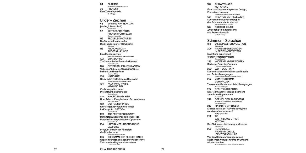 «Einen Blick in die Zukunft wirft auch die äusserst reichhaltige Publikation «Protest. Eine Zukunftspraxis», die bei Lars Müller Publishers erschienen ist. Die Autoren werfen hier die Frage nach der Relevanz des Protests in einer Zeit, in der im Gegensatz zu 1968 keine klaren ideologischen Fronten mehr auszumachen sind, auf.»
