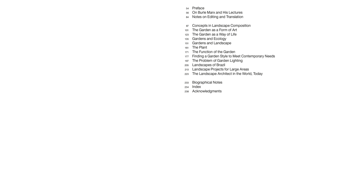 “The lectures of the great Brazilian landscape architect Roberto Burle Marx are finally gathered together and made available to an international readership.”