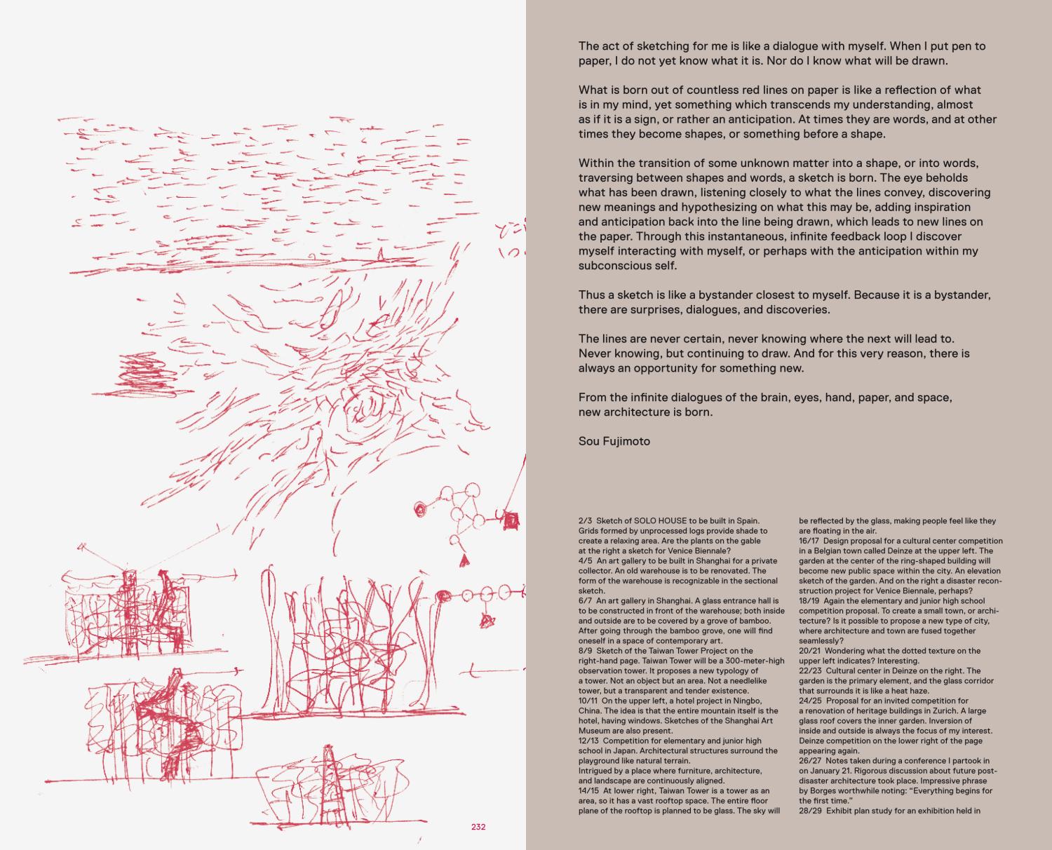 In his personal sketchbook Sou Fujimoto offers insights into his design process. Through the sketches, drawings, and notes readers can trace how his complex concepts are made manifest and develop on paper.
