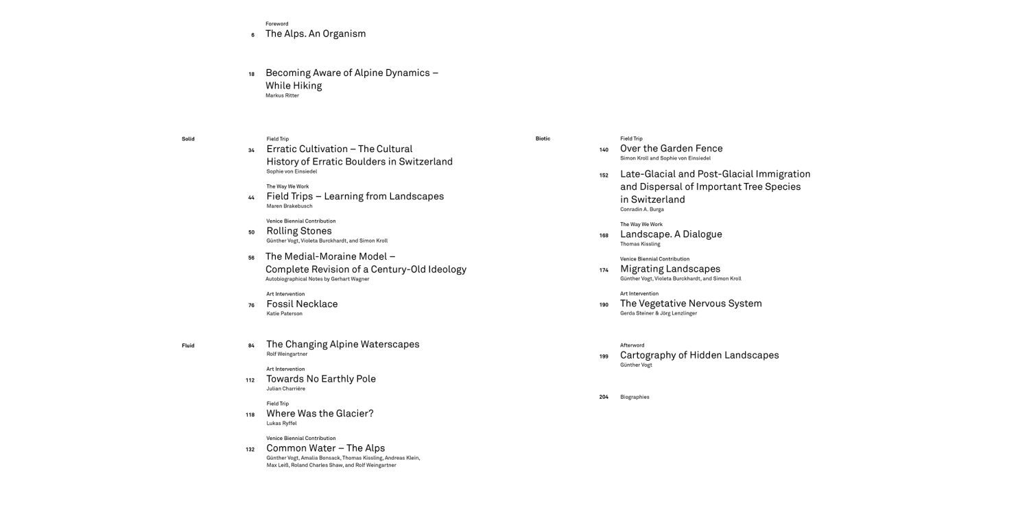 Various phenomena of this dynamic landscape were explored within the scope of the 17th Architecture Biennial in Venice by VOGT Landscape Architects and the Chair of Günther Vogt at ETH Zurich. This book documents their findings, and the phenomena are examined by focusing on the three thematic fields of geology, hydrology, and biology in scientific essays, art interventions, and on field trips.