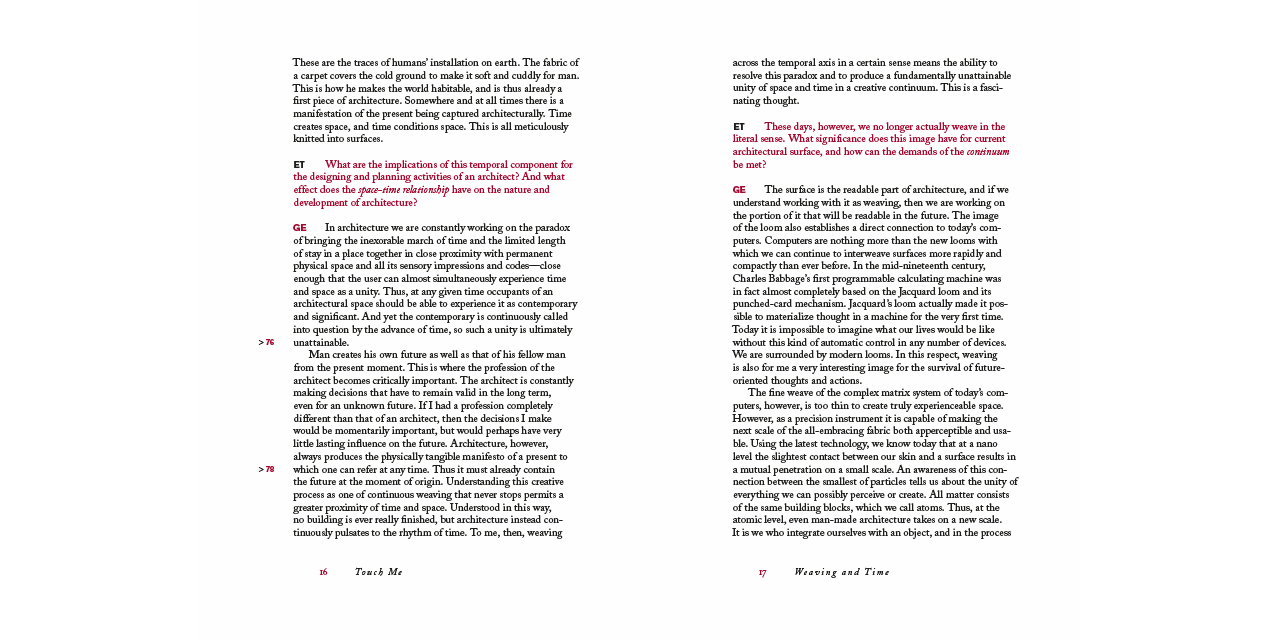 Gregor Eichinger argues that since the beginning of modernity the concept of surface has been neglected by architecture. A tendency for simplification, for a reduction to the abstract space and the material are the reason that today the topic is given such short shrift. Based on his research as a professor at the ETH Zürich, Eichinger calls for a serious discussion about the architectural user interface. In an intensive conversation, he and architect Eberhard Tröger discuss what alchemy has to do with architecture, why a good bar has to be a sketch, how one reads ornament, why we no longer look up at the ceiling, why cleanliness gets in the way of everything, how architecture is created from the inside, and much, much more. The text of this conversation is interwoven with a variety of related quotations and complemented by a series of images that deal with the relationship between architectural surfaces and people.