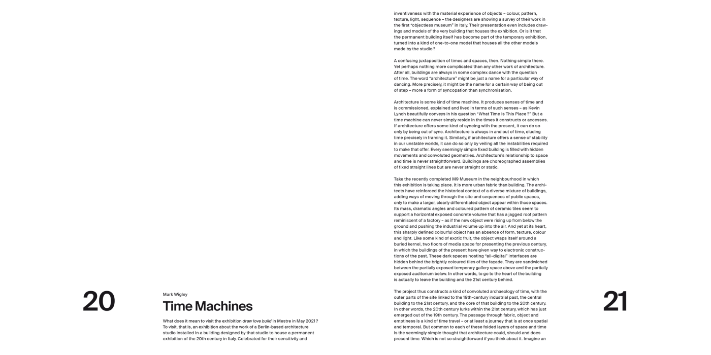 The authors include critics who have written on the work of the practice in the past, architectural colleagues and writers whose opinions and observations are respected by the editors as well as a handful of people who either live or work in one of their buildings and so have experienced Sauerbruch Hutton’s architecture firsthand. A photographic essay by the Finnish artist Ola Kolehmainen augments the twenty-five essays with works created between 1990 and 2020.