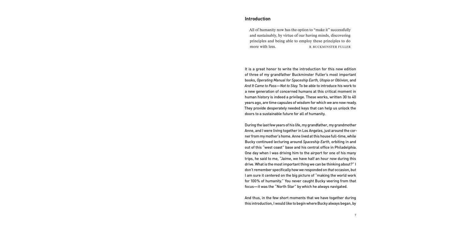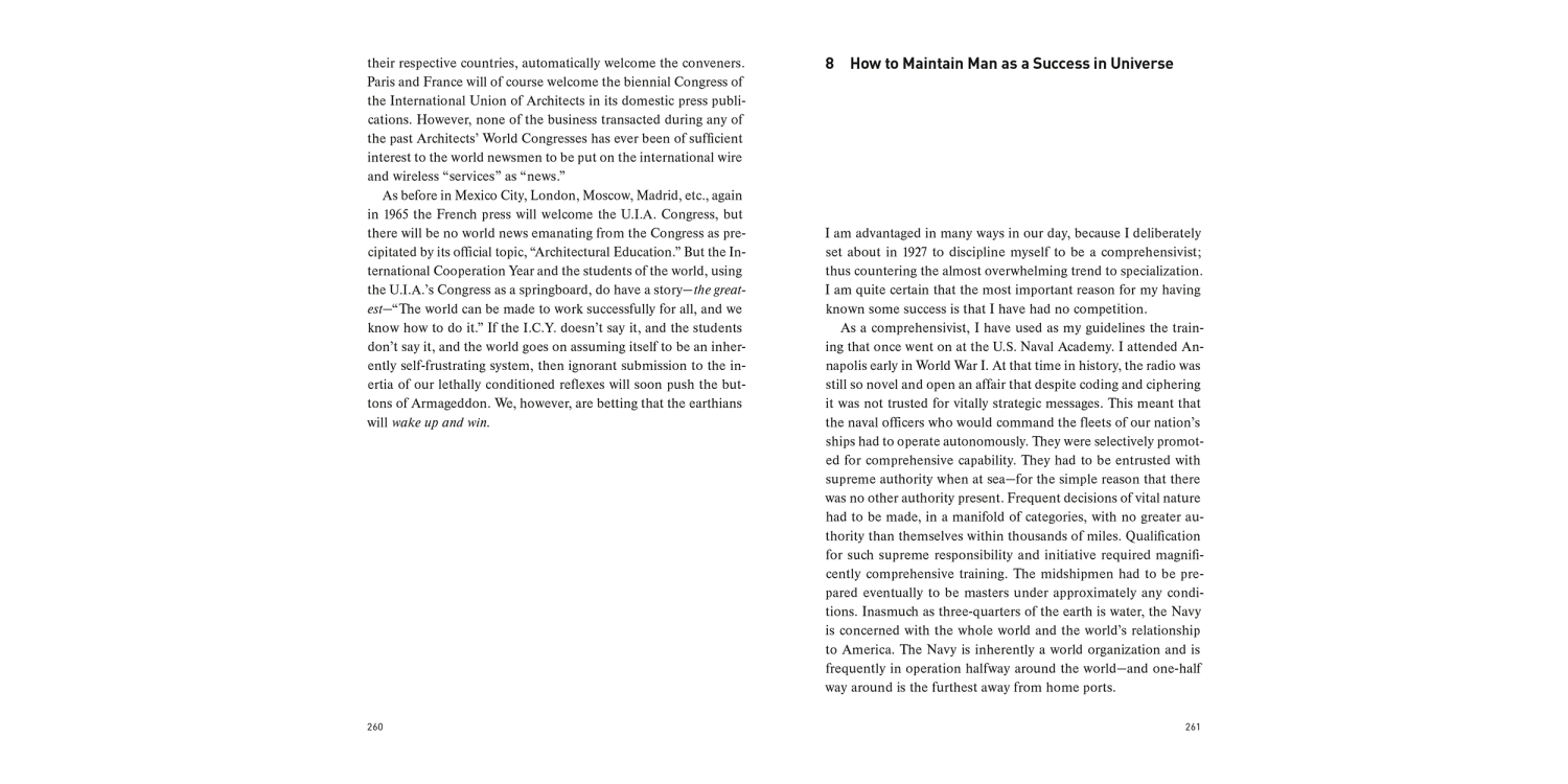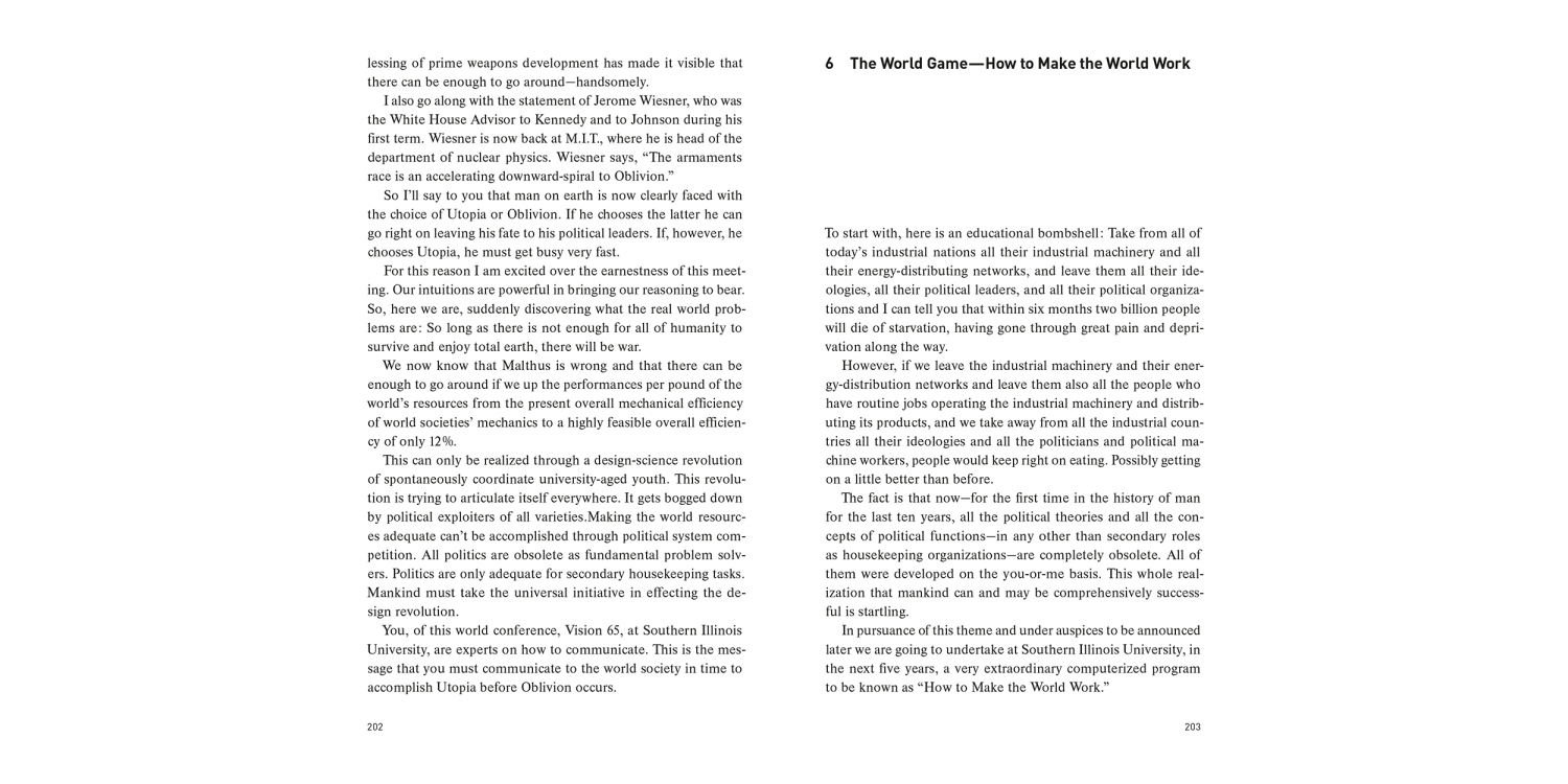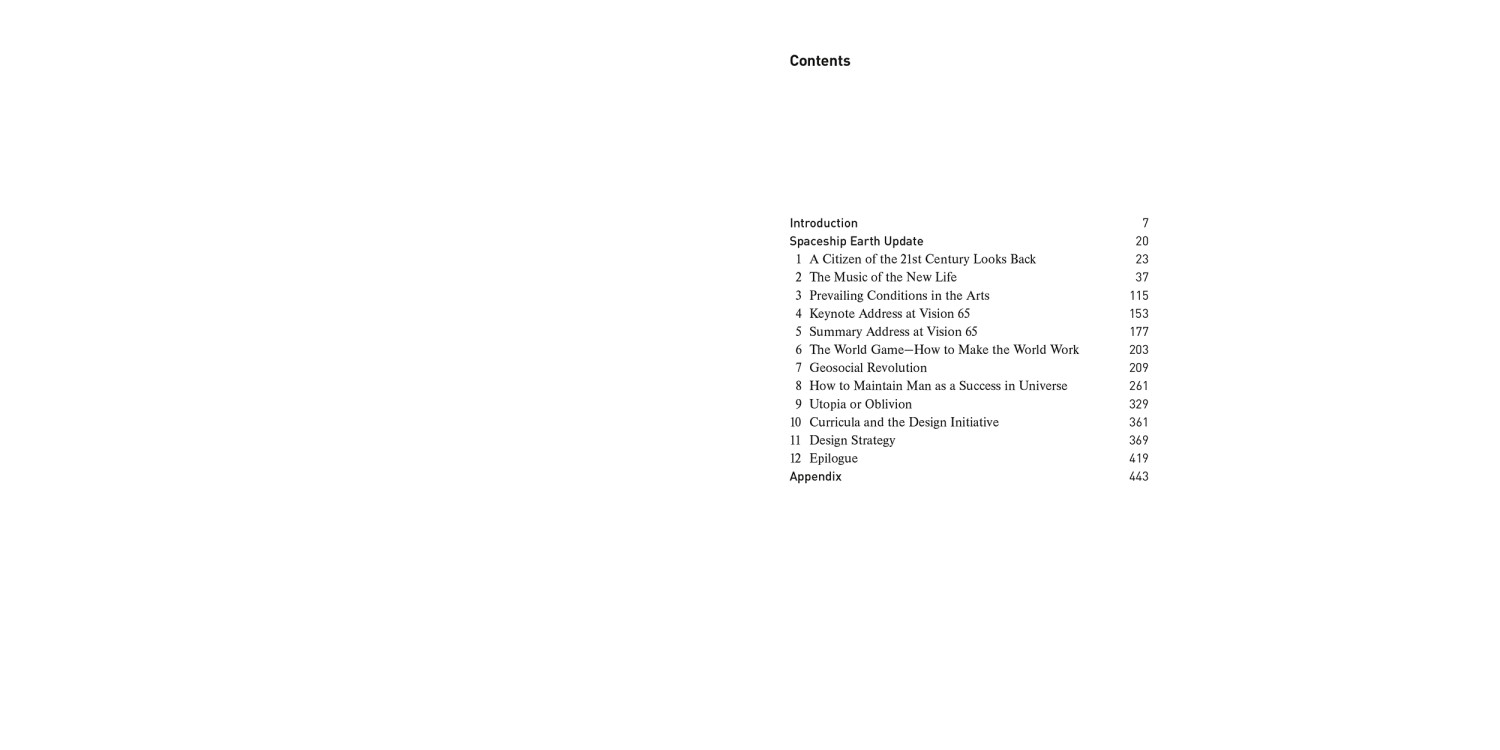 Utopia or Oblivion is a provocative blueprint for the future. This comprehensive volume is composed of essays derived from the lectures he gave all over the world during the 1960’s. Fuller’s thesis is that humanity—or the first time in its history—has the opportunity to create a world where the needs of 100% of humanity are met.
