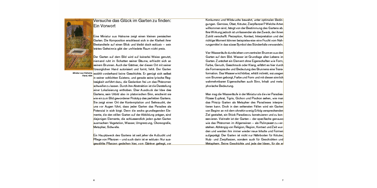 Versuche das Glück im Garten zu finden stellt in acht reich bebilderten Essays «Paradiese» vor, die auf individuellen und kollektiven Handlungen basieren: Gemeinschaftsgärten in Berlin, Kriegsgärten im Irak, Gebetsteppiche von Muslimen und Eruvs – Zäune, die ein jüdisches Wohngebiet umgeben und erlauben, eine Sabbatregel zu umgehen. Weitere Beiträge widmen sich dem vermeintlichen Paradies, dem gutgläubige Kreditnehmer erliegen, oder dem Whole Earth Catalog aus den 1970er Jahren, den man als frühen Vorläufer der Web-Suchmaschinen bezeichnen könnte.