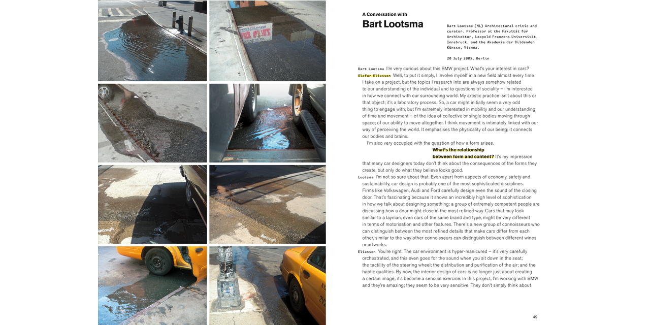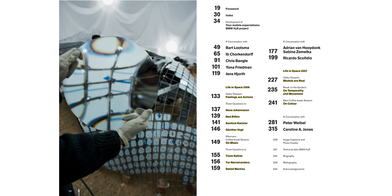 As part of its BMW H2R research project, Studio Olafur Eliasson is preparing a dense publication comprising extensive visual material; excerpts from two seminars held in 2006/2007; and conversations between Olafur Eliasson and a number of distinguished artists and thinkers. In the research project, Eliasson raises questions of formgiving and materiality, mobility, temporality, movement, and renewable energy. In 2005 a BMW H2R hydrogen-powered vehicle was delivered to Studio Olafur Eliasson and then stripped bare of its outer shell. To create a new skin several form studies have been carried out in a temporary geodesic dome, constructed in the yard of the studio. The final surface of the car consists of layers of ice, frozen around two intricate nets, mirrored plates and light. The “Climate car” can only exist in a microclimate with a temperature of minus 6 degrees Celsius or below.
